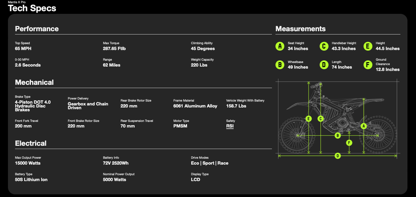 Make Pro features part of your next E-Moto. With all the speed, app controls, and tech you could want, the Mantis X Pro is built from aircraft-grade aluminum and rockets from 0–30 MPH in just 2.6 seconds. A fully tunable controller and Pro-tuned adjustable suspension make it a true contender in its class whether you’re racing or riding. The Mantis X Pro carves with confidence, grips every line, and stops on a dime.