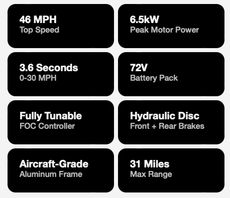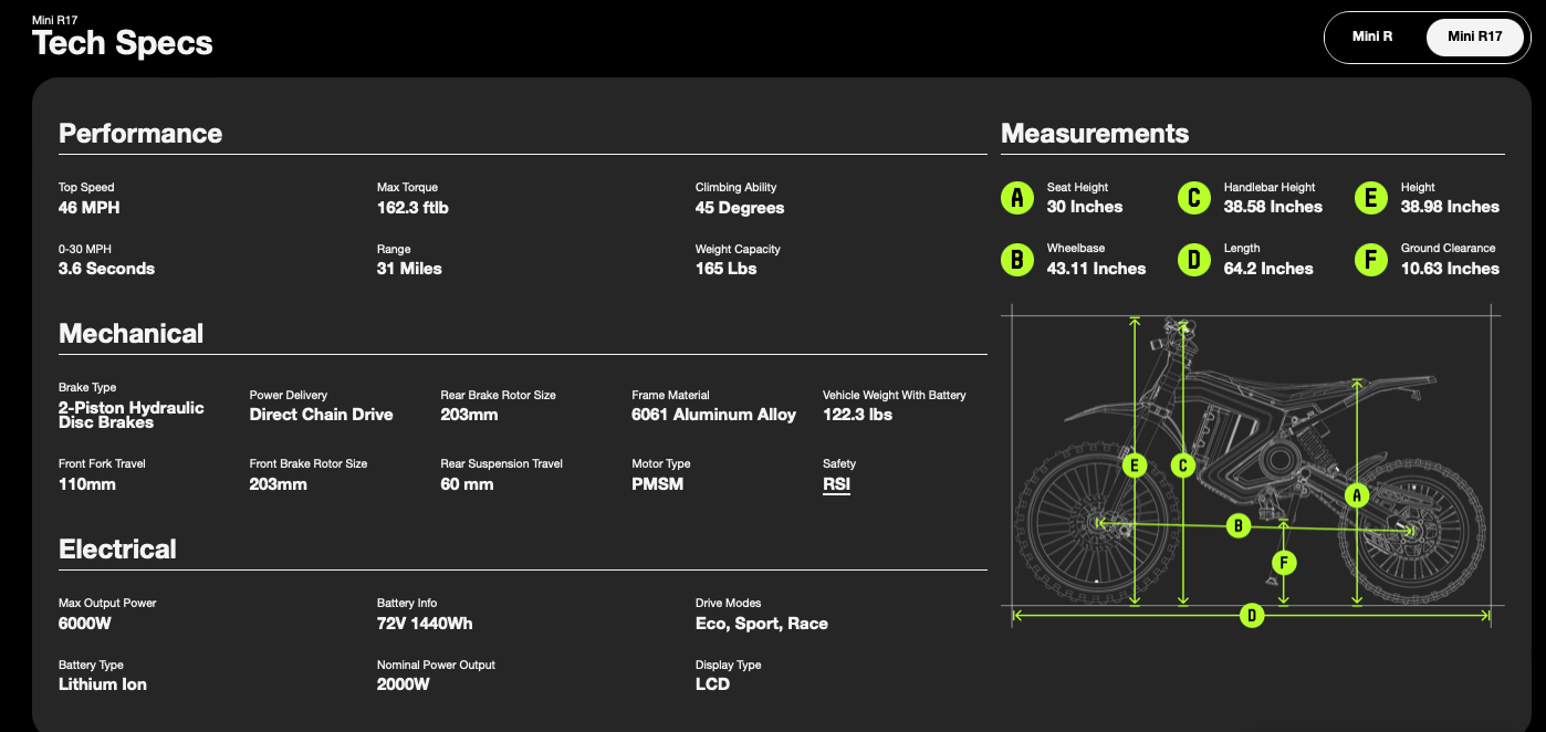 Dual Fit. The Mantis Mini R and Mini R17 are built for different rider heights while delivering the same thrill. Powered by a 72V battery and 6,000W PMSM motor, they launch from 0–18 MPH in 1.6 seconds and top out at 46 MPH. Parents and young pros can fine-tune power and speed with our app-enabled controller for total control. With aircraft-grade aluminum, hydraulic brakes, and adjustable suspension, the Mini R series delivers real performance with family-ready safety features.